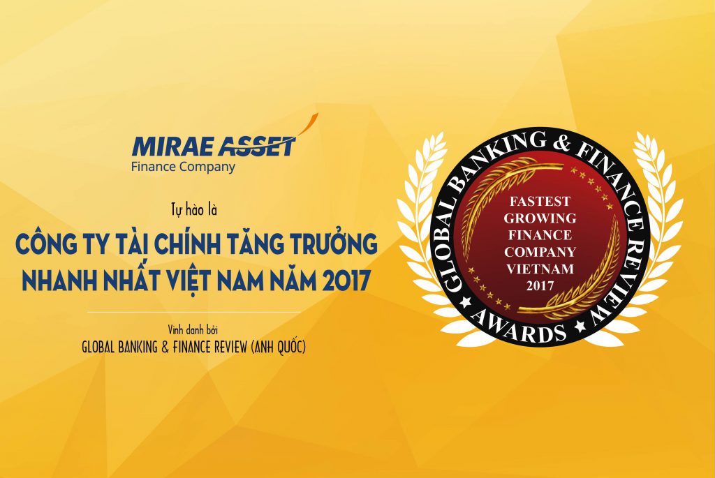 Công ty Tài chính Mirae Asset vinh dự nhận được giải thưởng “Công ty tài chính tăng trưởng nhanh nhất Việt Nam năm 2017” từ tổ chức toàn cầu Global Banking & Finance Review (Anh Quốc). Đây là giải thưởng lớn trong khuôn khổ giải thưởng quốc tế Global Banking & Finance Review Awards được tổ chức hàng năm để vinh danh các tổ chức tài chính, các công ty trên toàn cầu có sự nổi bật về thành tích, chiến lược và có những thành công mang tính cấp tiến và đầy cảm hứng cũng như mang tới những giá trị tốt nhất cho khách hàng. Giải thưởng này là sự công nhận cho những nỗ lực không ngừng của ban lãnh đạo và toàn thể nhân viên công ty tài chính Mirae Asset nhằm mang đến những sản phẩm và dịch vụ tài chính tốt nhất, góp phần nâng cao chất lượng cuộc sống cho người Việt Nam.